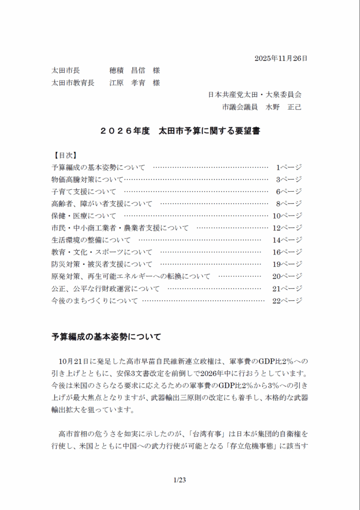 ●2026年度 大田市予算に関する要望書(PDF) 日本共産党太田大泉委員会として11... -