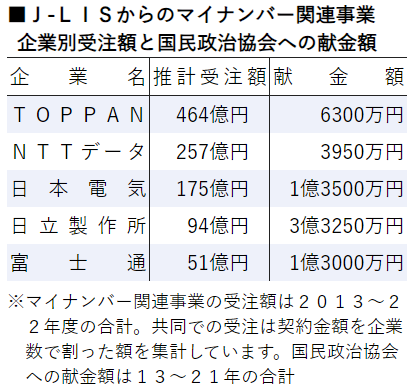「地方公共団体情報システム機構」(J-LIS)からマイナンバー関連事業で巨額発注を受けた大企業5社が、自民党の政治資金団体「国民政治協会」に2013~21年の9年間に合計7億円を献金していたことが2023年10月8日、日本共産党の「しんぶん赤旗」の調べで分かりました。マイナンバー事業を進めてきた政権党と、受注企業の癒着の一端が明らかになった形です。