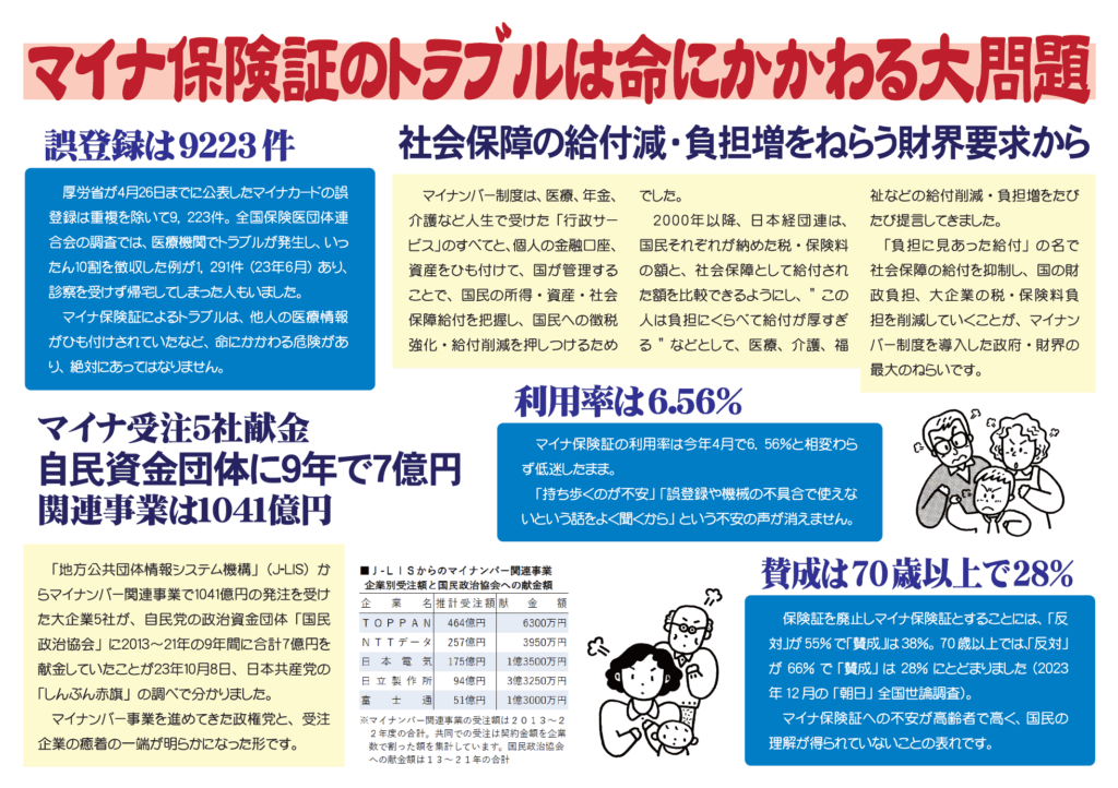 厚労省が4月26日までに公表したマイナカードの誤登録は重複を除いて9,223件。全国保険医団体連合会の調査では、医療機関でトラブルが発生し、いったん10割を徴収した例が1,291件(23年6月)あり、診察を受けず帰宅してしまった人もいました。