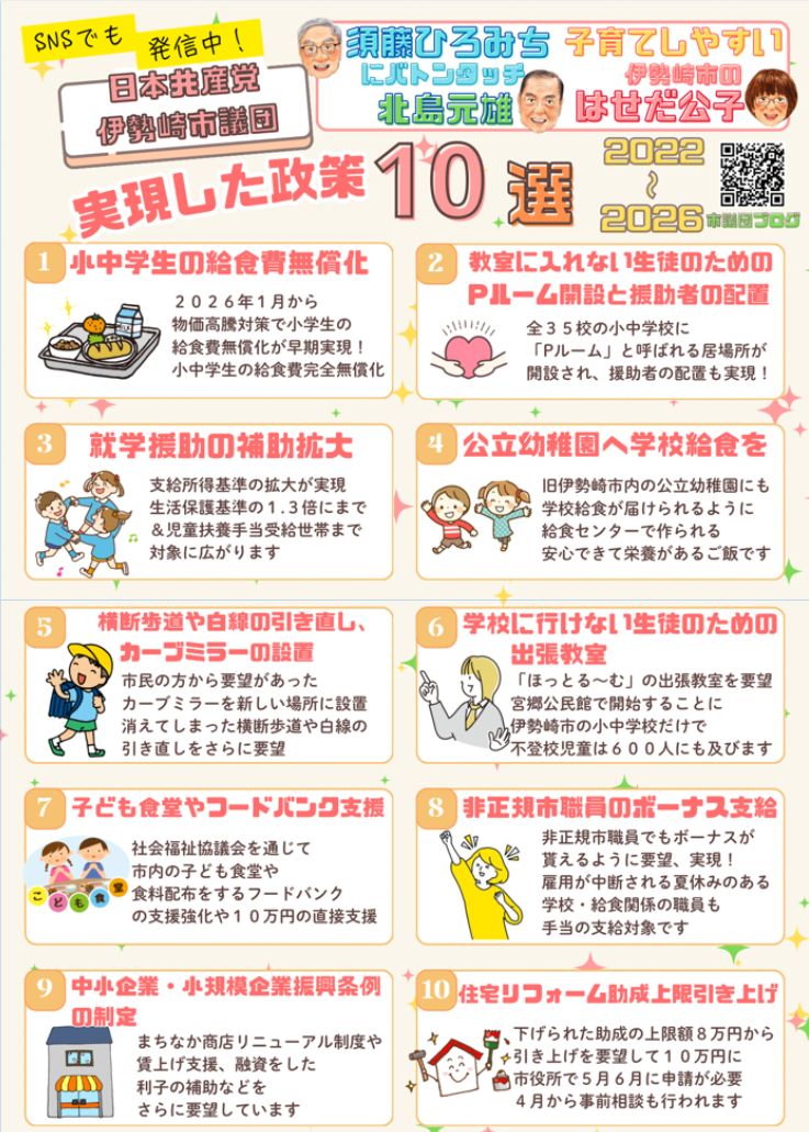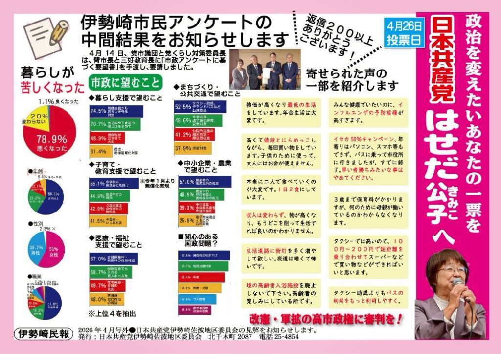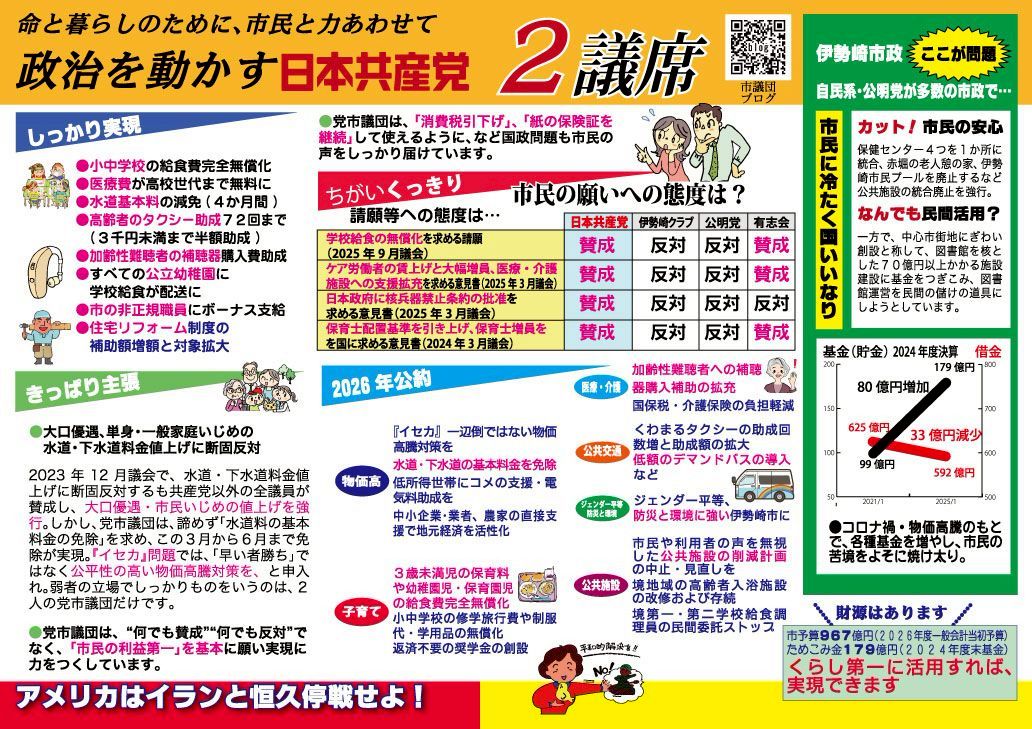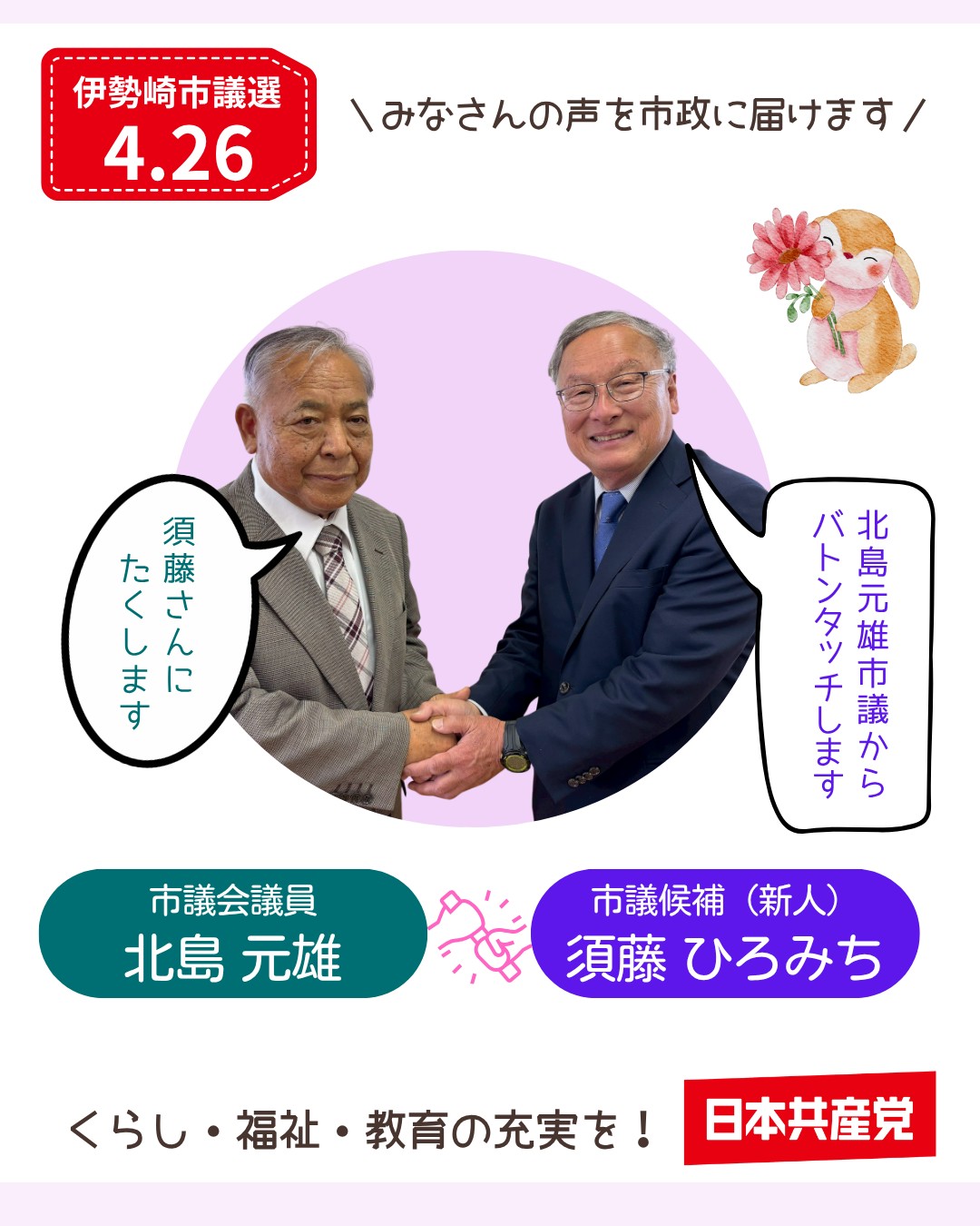 伊勢崎市議選は定数30に35人が立候補。5人はみ出しの大激戦・大接戦です。物価高と大軍拡・大増税から暮らしを守るため、日本共産党の2議席確保にお力をお貸しください。