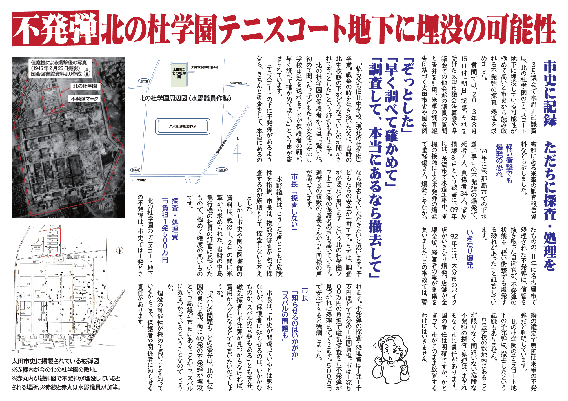 市長は、北の杜学園のテニスコート地下を磁気探査し不発弾が見つからなければ、費用がムダになるとでも言いたいのでしょうか。「スバルの問題も」との市長答弁は、北の杜学園の東に2発、南に40発の不発弾が埋没という記録が市史=米軍調査報告にあることから、市長はスバルに気をつかっているということなのでしょうか。