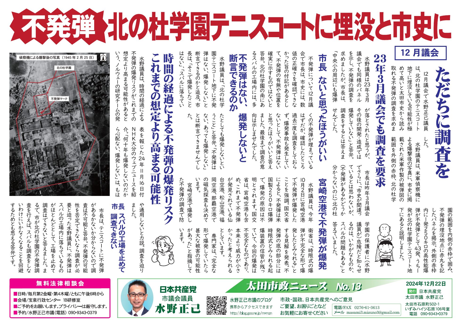 12月議会の一般質問では、北の杜学園のテニスコート地下に埋没している可能性が極めて高いと太田市史から読み取れる不発弾の調査を求めました。