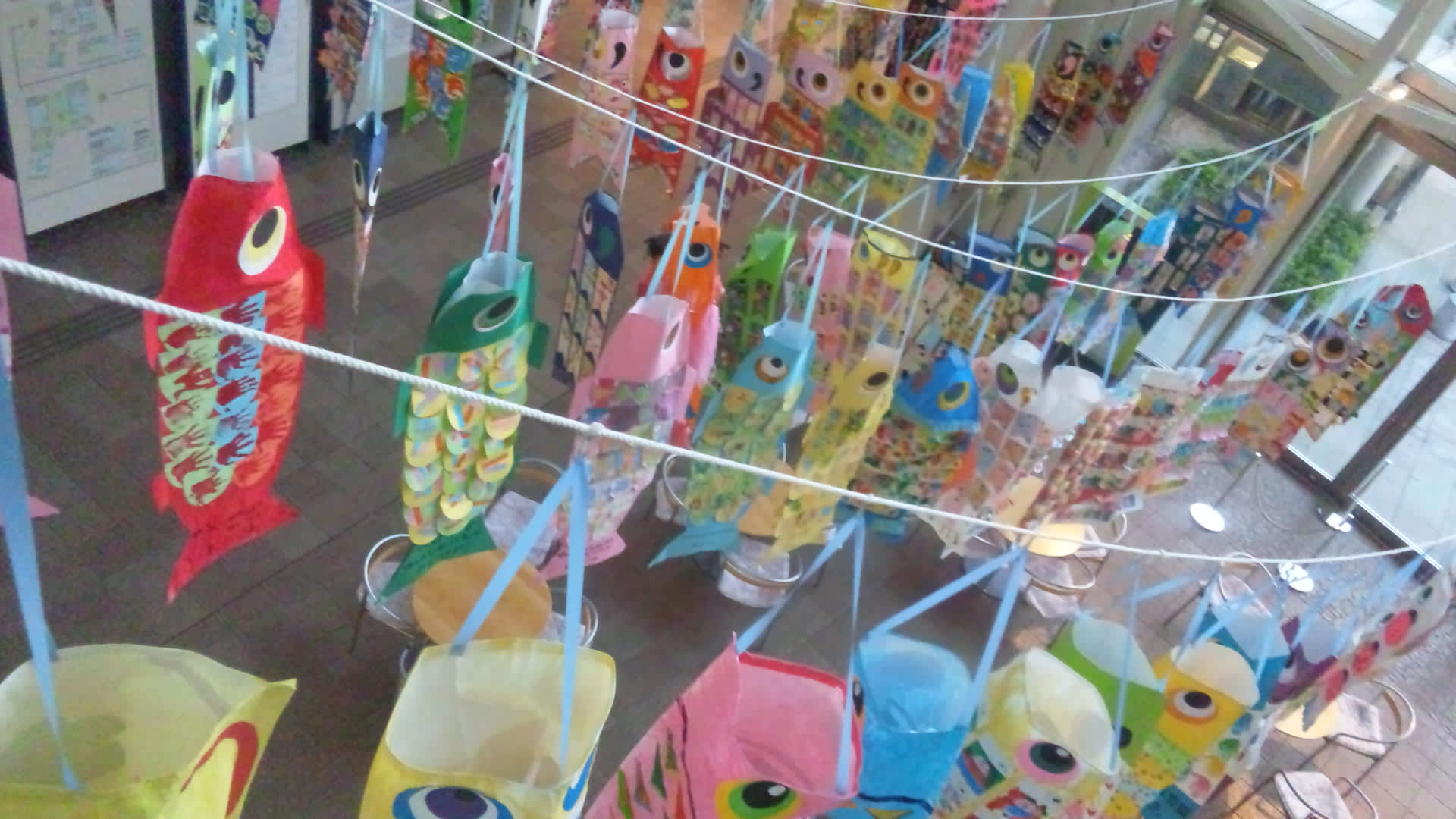 太田市内の幼稚園、保育園の子どもたちが心を込めてつくったこいのぼりが市庁舎1階ロビーにさがっています。
