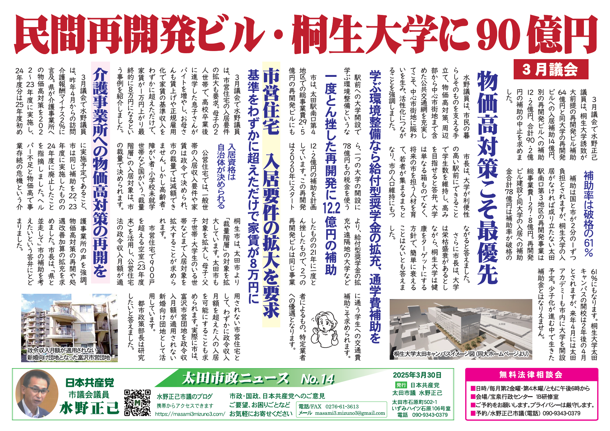 民間再開発ビル・桐生大学に90億円 求められるのは給付型奨学金の拡充、通学補助 桐生大学太田キャンパスイメージ図(同大ホームページより) 3月議会の予算に対する総括質疑では、桐生大学誘致が大前提の再開発ビル補助64億円と同大学の再開発ビルへ...