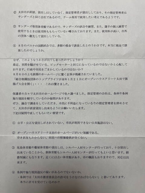 さらに手紙では、市民に不利益となっている今の指定管理者(サンダーズ)を辞めさせ、市の他の体育館のようにシルバー人材センターを指定管理者にするなどの対応も求めています。