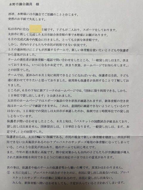 手紙では、女性のお子さんの所属チームが新体育館を使おうと5月、8月上旬に問い合わせたところ、個人への貸し出しは未定で、団体への貸し出しは一日単位と言われたとあります。