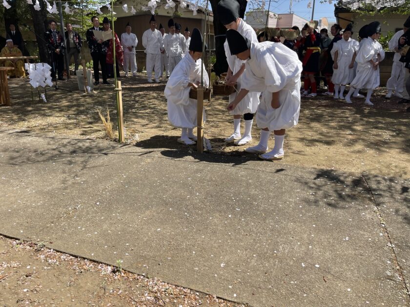 東長岡神明宮は、元亨(げんこう)3年(1323)に伊勢神宮より分霊を勧請して創建されたと伝えられ、お田植祭は、稲の豊作を予祝する行事(神事)で、毎年4月の第2日曜日に行われています。
