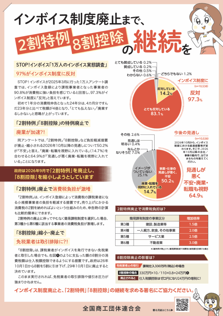 同アンケートでは、「2割特例」「8割控除」など負担軽減措置が廃止・縮小される2026年10月以降の見通しについて50.2%が「不安」と答え、「廃業・転職を視野に入れている」(14.7%)を合わせると64.9%が「見通しが悪く廃業・転職を視野に入れている」ことになります。
