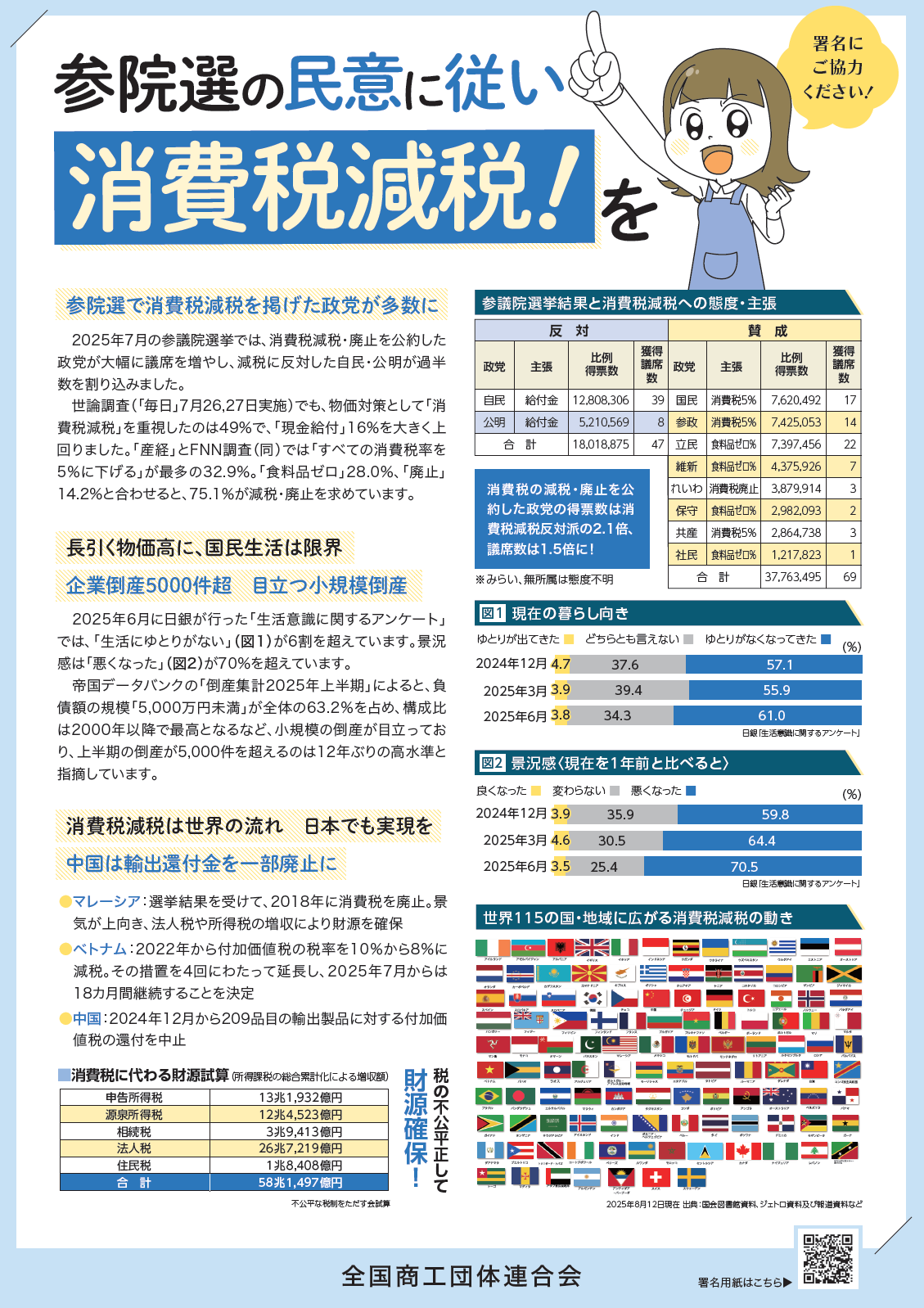 7月の参議院選挙では、物価高対策が最大の争点となり、消費税減税とインボイス制度を廃止するよう訴えた政党が得票・議席数とも多数となりました。消費税減税とインボイス制度の廃止を求める民意は明確と言えます。