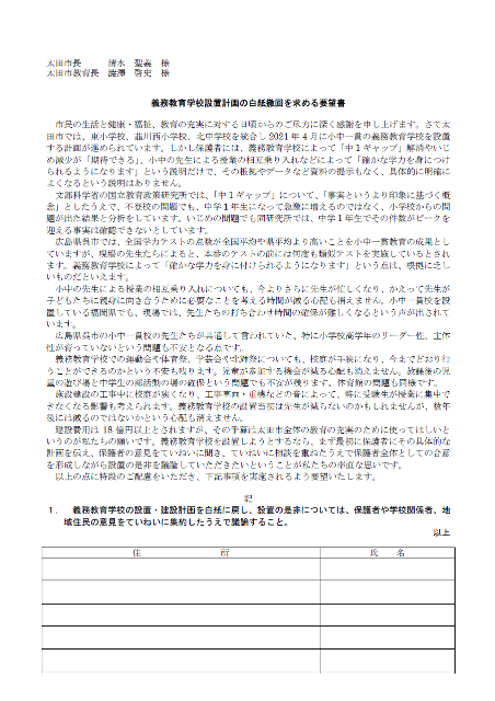 太田市が進めている、東小・韮西小・北中を統合して小中一貫の義務教育学校を2021年度に19億円以上かけて建設する計画の白紙撤回を要望する署名活動です。