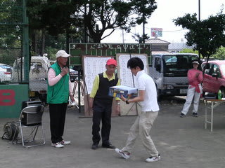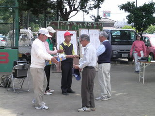 (写真)準優勝の賞状と賞品を受け取る東金井1区Aチームの代表者