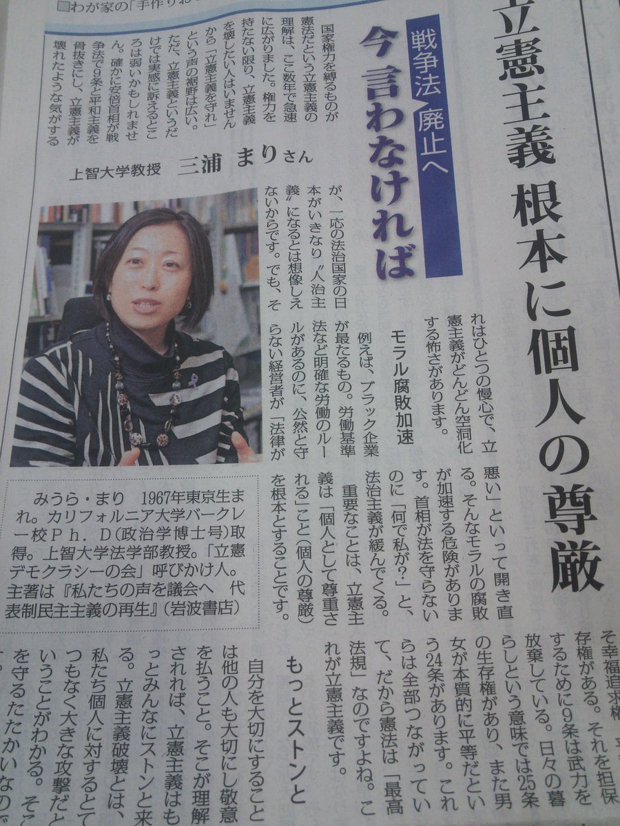 今朝の赤旗に上智大教授の三浦まりさん。「立憲主義の空洞化は、ブラック企業などモラル腐敗を加速させる危険がある」など、わかりやすい。必読インタビューよ。