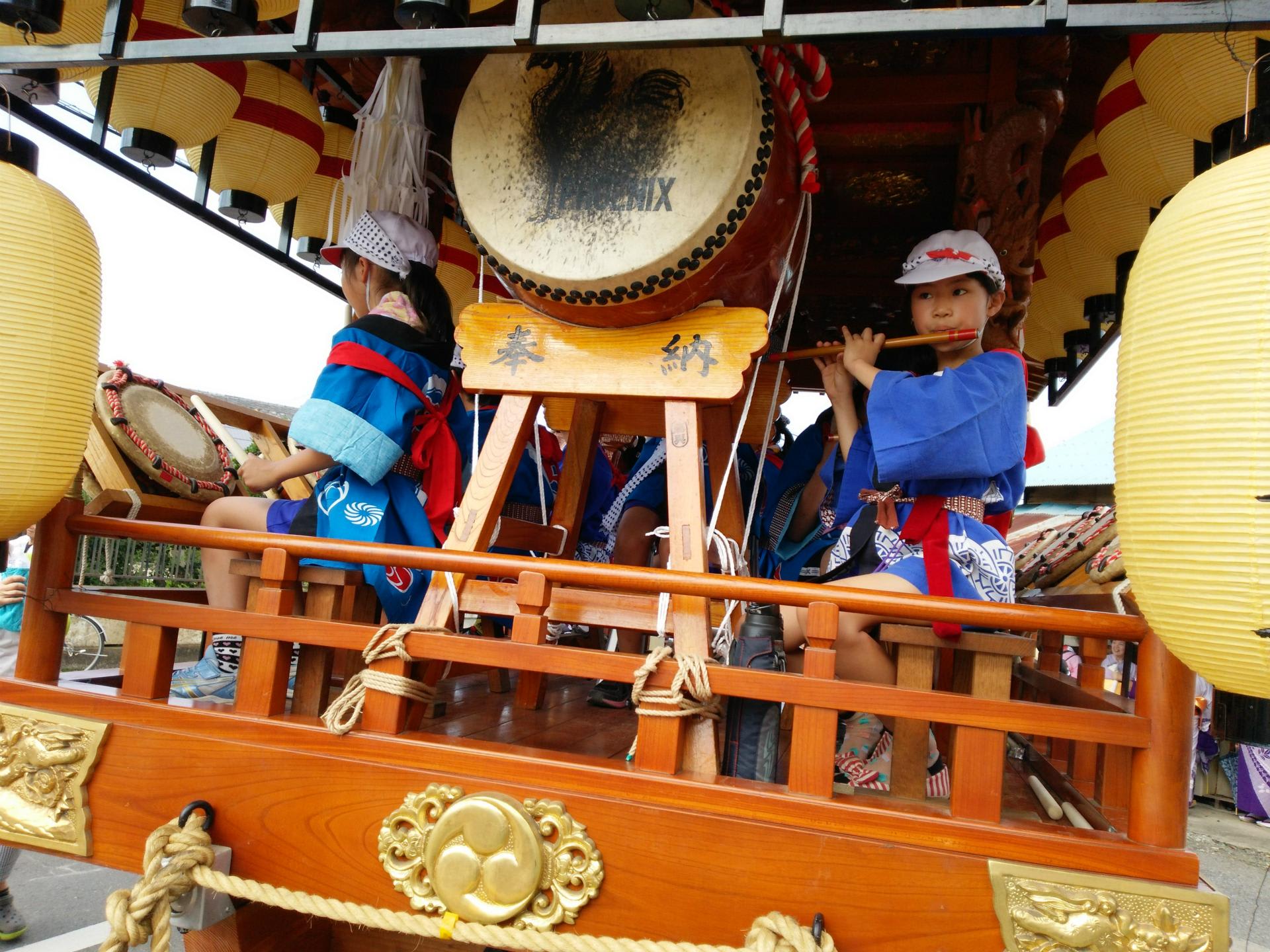 山車の巡行は午後1時から。子どもたちにとっては、この日のために2週間、笛や太鼓、鐘などお囃子の練習を続けてきた成果を披露する晴れ舞台。猛暑の中でも元気いっぱいにお囃子を演奏し、大人にまじって山車を引きました。