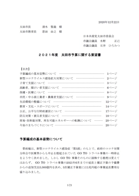 日本共産党太田市委員会・市議団の連名で22日、2021年度太田市予算編成に関する要望書を市長、教育長あてに提出しました。