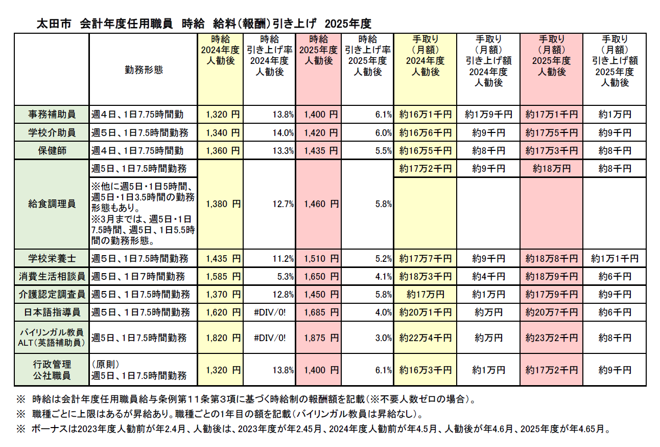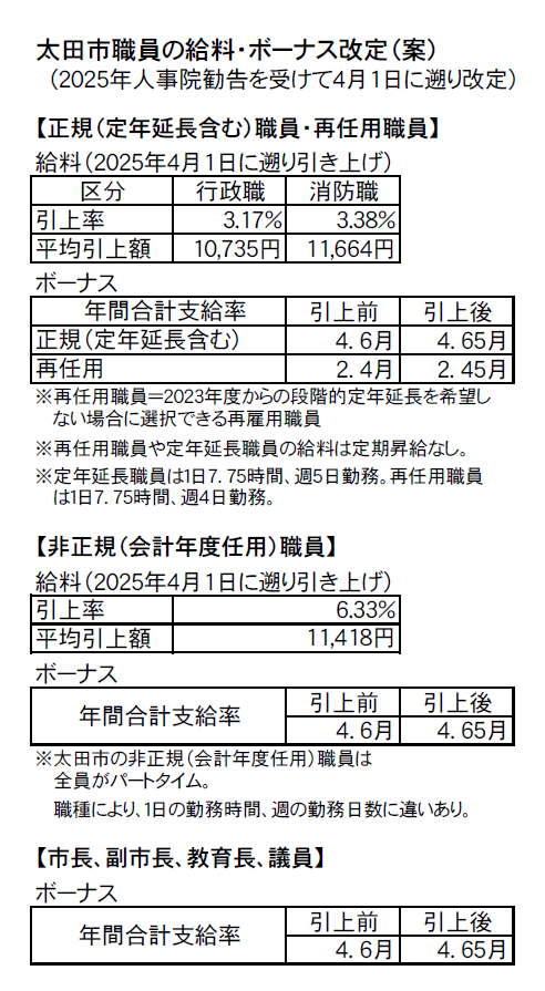 再任用職員も含めて、行政職で平均3.17%、10,735円引き上げ、消防職で平均3.38%、11,664円引き上げ。非正規の会計年度職員の給料も、正規職員の給料引き上げに伴い、平均11,418円引き上げ。
