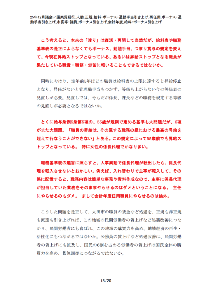16日の太田市議会最終日の本会議では、人勧準拠のための議案に質疑。総務省による自治体への〝定員適正化計画〟の押し付けによって55歳で昇給ストップとなる状況が20年近く続いていますが、太田市では53歳でも昇給ストップとなる職員がいる問題を明らかにしました。