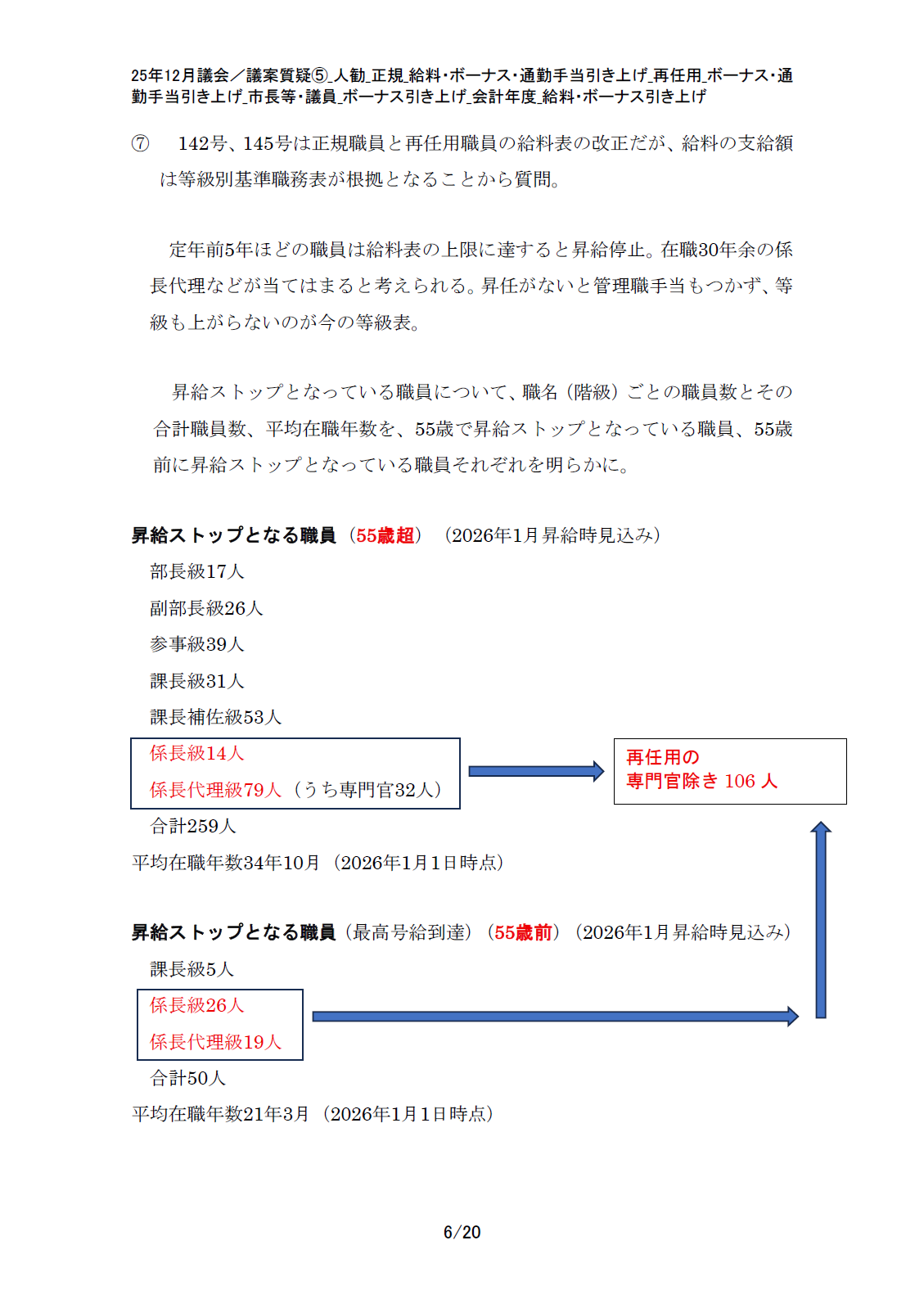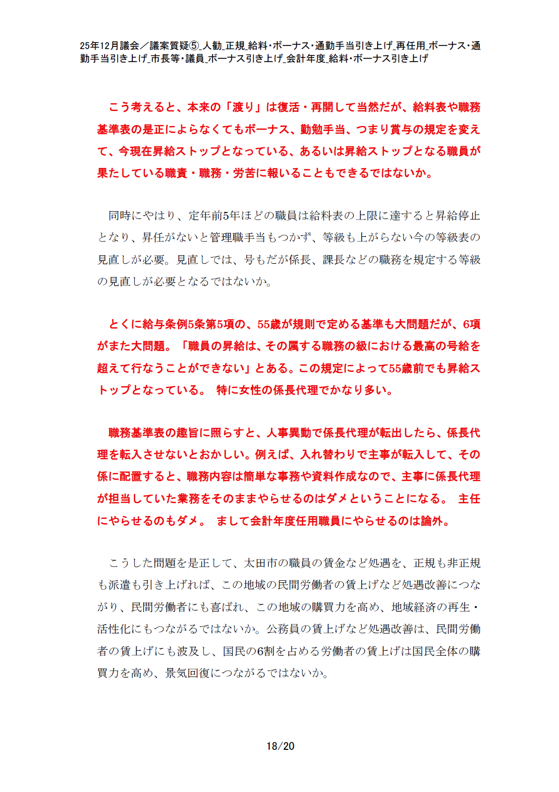 16日の太田市議会最終日の本会議では、人勧準拠のための議案に質疑。総務省による自治体への〝定員適正化計画〟の押し付けによって55歳で昇給ストップとなる状況が20年近く続いていますが、太田市では53歳でも昇給ストップとなる職員がいる問題を明らかにしました。