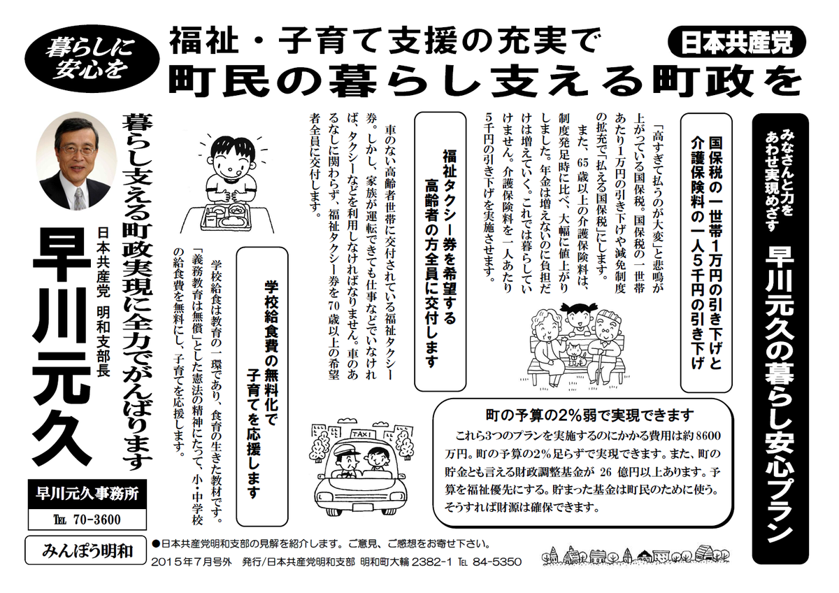 今日も前明和町議の早川元久さんの応援に行ってきました。午後は地元の夏祭りや作家の澤地久枝さんら111人が呼びかけた「アベ政治を許さない!」全国いっせい行動があって太田に戻りましたが、明和では「やっぱり共産党の議員が必要」という声があちこちから寄せられます。