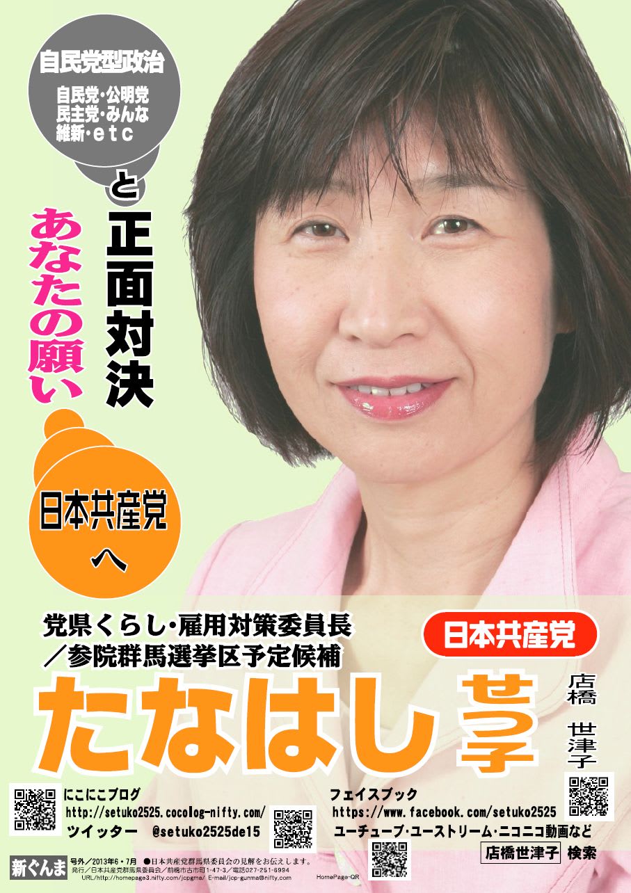 明日の投票日は、自民党の暴走をくい止めるため、群馬選挙区はたなはしせつ子とお書きください。ビラのB面です。 blogimg.goo.ne.jp/user_image/07/…