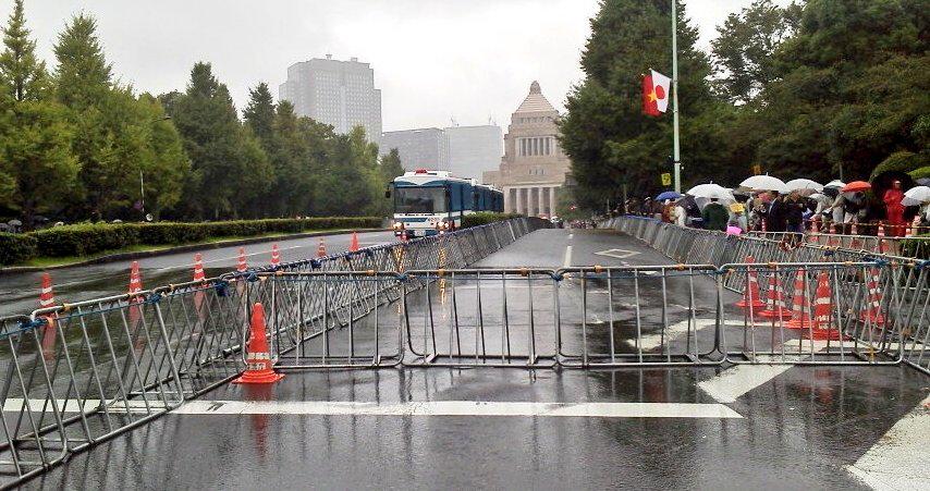 国会前。すでに警察が柵を設置しています。昼過ぎから、人が続々と押し寄せています。永田町駅まで大勢の人たちが見えます。(nh) pic.twitter.com/oTxjUYrgwa