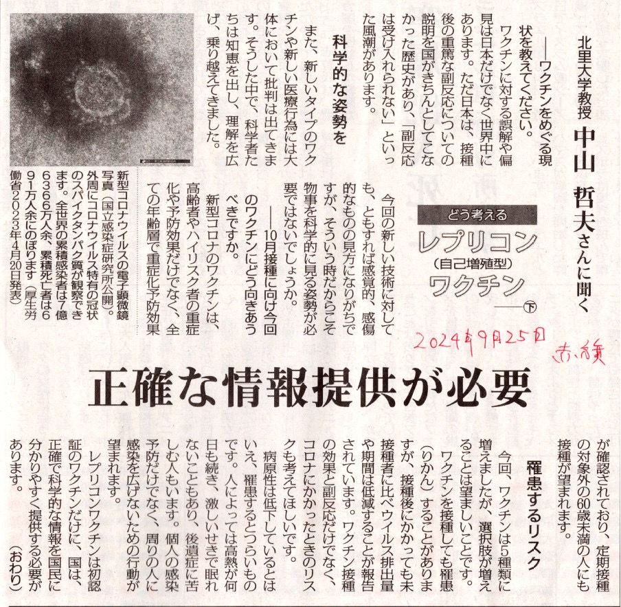 そして中山名誉教授は、「レプリコンワクチンは初認証のワクチンだけに、国は、正確で科学的な情報を国民に分かりやすく提供する必要がある」としています