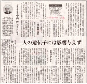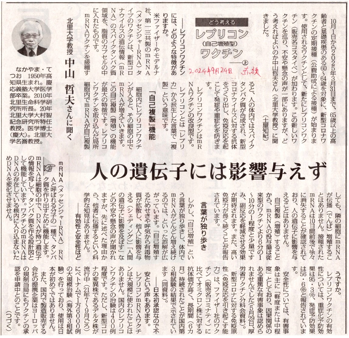 しかし北里大学の中山哲夫名誉教授は、(昨年9月に)レプリコンワクチンはメッセンジャーRNAワクチンの改良型であり、「レプリコンワクチンを取り込んだ局所細胞内でmRNAが自己複製しても、隣の細胞に伝播増殖することはない」としています。