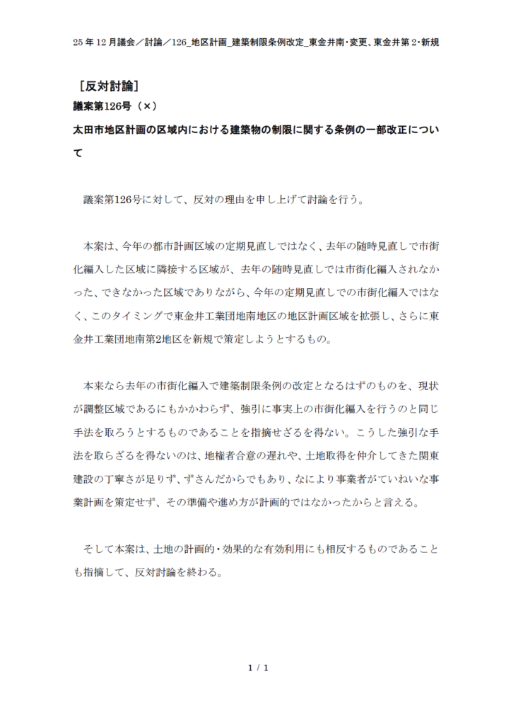 調整区域にスバルのモータープール 土地の計画的利用に反する建築制限条例改定に反対討論